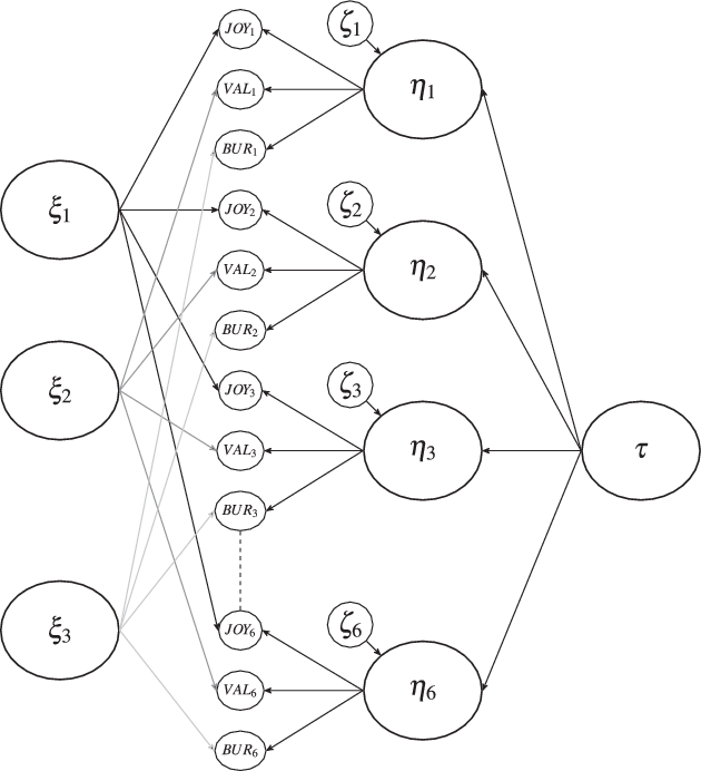 To estimate these coefficients, we apply the model to all six waves (2008–2013) of the LISS panel in which the SAS was included, taking the three subscales of the SAS as separate indicators. We calculate the average subscale score for each person at each panel wave and use these scores as observed variables in the model. These scores are indicated in Fig. 1 as JOY1, VAL1, BUR1, and so on.