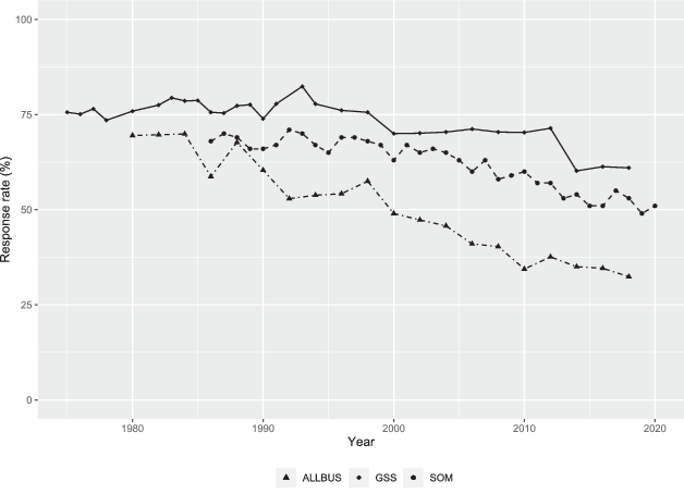 Fig. 1 Response rates reported in GSS (U.S.), ALLBUS (Germany), and the SOM Institute (Sweden)For compiled response rates, see GSS (2023), Schwemmer (2022), and Bergquist et al. (2023). Response rates for the GSS and ALLBUS surveys correspond to RR5 (AAPOR, 2023), according to Gummer (2019). The SOM survey response rates correspond to RR6 (AAPOR, 2023).
