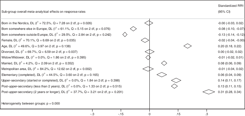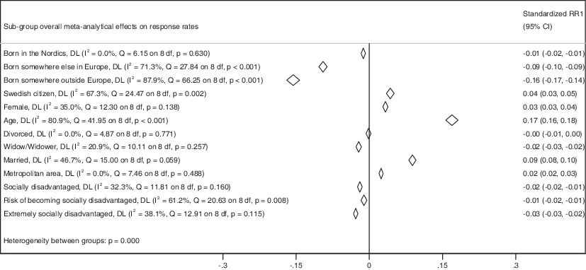 The second strongest predictor was the sampled persons country of birth (see Fig. 2). Sampled persons not born in Europe were statistically significantly less likely to complete the questionnaires (𝛽pooled = −0.16, p < 0.001, 95% CI[−0.17, −0.14]) than persons born in Sweden. Similarly, sampled persons born somewhere else in Europe but outside the Nordics were also less likely to complete the questionnaire (𝛽pooled = −0.09, p < 0.001, 95% CI[−0.10, −0.09]), whereas those born in the Nordics but not in Sweden were only slightly less likely to complete the questionnaire (𝛽pooled = −0.01, p < 0.001, 95% CI[−0.02, −0.01]) than persons born in Sweden. Furthermore, the predictive ability of not being born in Sweden on questionnaire completion was heterogeneous over time for those born outside Europe (Q(8) = 66.25, p < 0.001; I2 = 88%) and those born in Europe outside the Nordics (Q(8) = 27.84, p < 0.001; I2 = 71%), but was homogenous for those born in the Nordics (Q(8) = 6.15, p = 0.63; I2 = 0%).