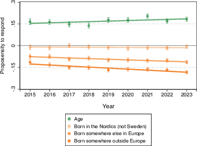 This age-period-cohort logic can be applied to other cohorts as well. For example, cohorts of immigrants, where unlikely-to-participate immigrants from some geographical areas replace likely-to-participate immigrants from other geographical areas (in a migration-period-cohort analysis). Such a cohort replacement may be especially likely to affect response propensities in countries like Sweden, where the share of the foreign-born population increased rapidly in the past two decades, from 11% of the population being foreign-born in 2000 to 21% foreign-born in 2023 (Statistics Sweden, 2024).