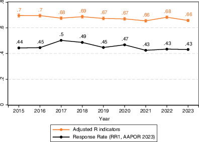 Fig. 5 Bias (adjusted R indicators) and the response rate for the years 2015–2023.Adjusted R indicators values were based on the discrepancy between respondents and nonrespondents regarding sex, age, being foreign-born, marital status, citizenship, living in a metropolitan area, and living in a socially disadvantaged area, and estimated through logistic regression.Source: SOM Institute (2024)
