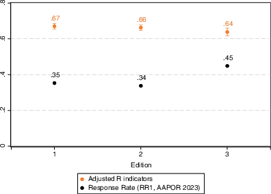 Fig. 6 Bias (adjusted R indicators) and the response rate for the three different editions of the Swedish National Election Study 2022.Adjusted R indicator values were based on the discrepancy between respondents and nonrespondents regarding sex, age, being foreign-born, marital status, education, and living in a metropolitan area, and estimated through logistic regression.Source: SNES (2023)
