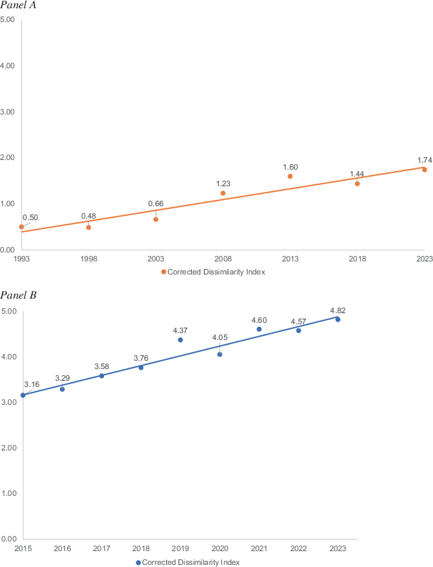 Fig. 7 Corrected dissimilarity index for birth cohorts (Panel A, 5‑year intervals) or being foreign-born or not (Panel B, 1‑year intervals) between 1993–2023.The corrected dissimilarity index was estimated by comparing respondents (RR1) to the full population.Source: SOM Institute (2024).