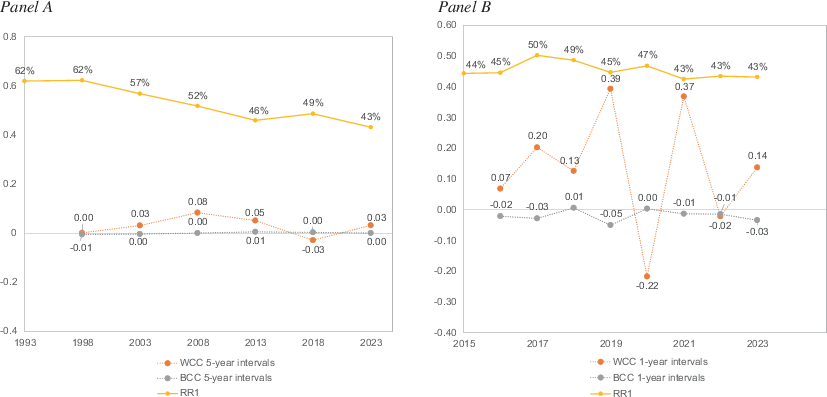 Fig. 8 Decomposition of change and the response rate for birth cohorts (Panel A, five-year intervals) and being foreign-born or not (Panel B, one-year intervals) between 1993–2023.Corrected dissimilarity index estimated by comparing respondents to the full population. WCC means within cohort change, BCC means between cohort change, and RR1 means response rate according to AAPOR, RR1.Source: SOM Institute (2024)