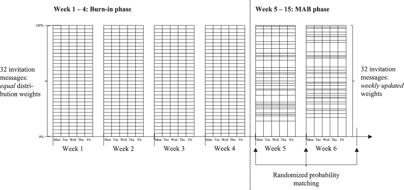 Fig. 1 Stylized Experimental Procedure with Adaptive Randomization. Each column in this stylized figure represents the distribution of the 32 invitation message alternatives on a single workday. The size of a rectangle illustrates the distribution weight of an individual message alternative. During the first four weeks—the burn-in phase—all messages are distributed equally. From week 5 onward, the MAB algorithm adjusts the weighting of each message version based on its posterior probability of being optimal. Within a given week, these weights remain constant. A clipping constraint ensures that each message alternative receives at least four allocations per day, with the remaining daily contacts distributed randomly among the other message versions according to their weights.