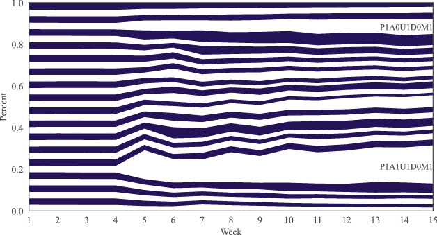 An examination of Fig. 3 and the confidence intervals for each invitation’s predicted starting rate reveals a noteworthy trend: Messages with higher starting rates tend to have narrower confidence intervals, while weaker-performing messages show wider confidence bands. This pattern reflects the weighting procedure inherent in MAB optimization, allocating greater weight to messages associated with higher survey starts.15 For instance, the invitation message alternatives with the highest predicted starting rates (P1A1U1D0M1 and P1A0U1D0M1) received disproportionately high distribution weights through adaptive randomization, as shown in Fig. 2.