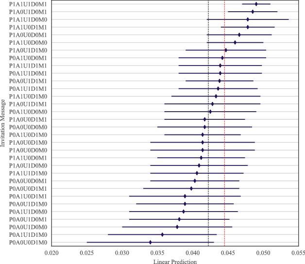Fig. 3 Prediction of Starting Rates. This figure presents OLS margins for the starting rates of each message alternative as well as their 95% confidence intervals with robust standard errors. The starting rate is defined as the share of firms that commence the survey after opening the invitation email. The two dashed vertical lines represent different mean values: the red line indicates the average starting rate based on the realized distribution during the experiment (with MAB optimization), while the black line shows the equally weighted average starting rate across all message versions. Thus, the black line approximates the starting rate of an experiment with fixed and balanced randomization.