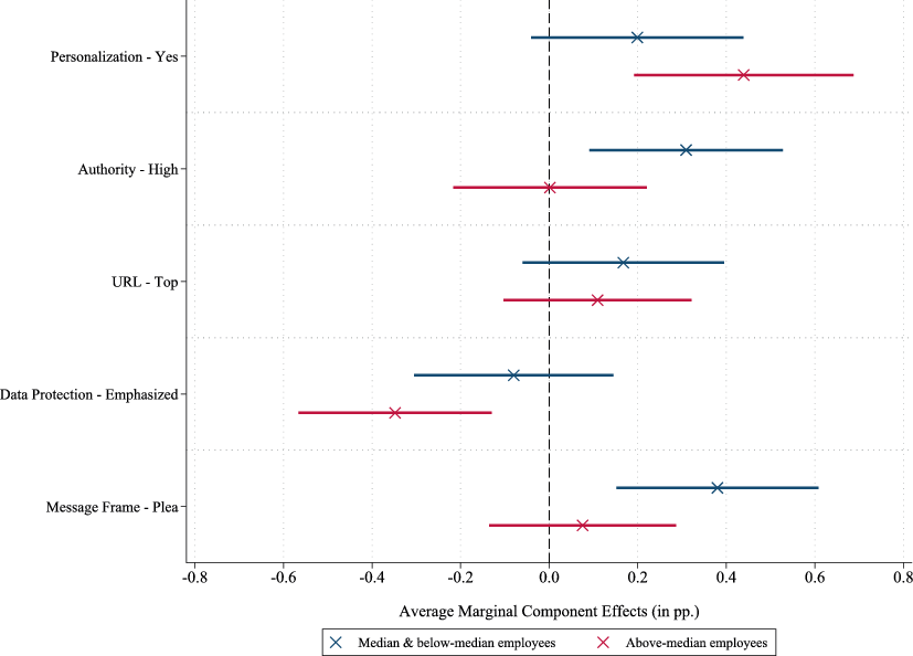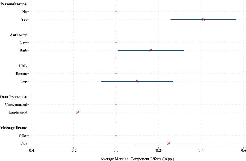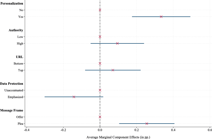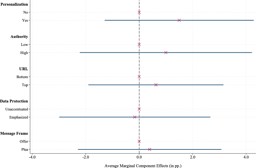 The results of the corresponding conjoint analysis are shown in Fig. 7. They remain largely consistent with those in the main specification. Personalization and pleading for help significantly increase response rates compared to unpersonalized invitations and offer frames. The effects of emphasizing authority and data protection are no longer statistically significant at the 5% level. Nonetheless, the analysis still suggests that emphasizing data protection in the invitation message does not improve survey participation.