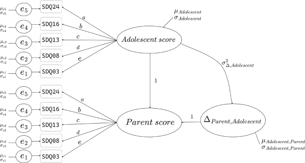 The latent difference score (LDS) method (de Haan et al. 2018) offers a structural equation modelling solution to the limitations of popular discrepancy models. LDS models estimate discrepancies as differences in latent factors, the underlying constructs one wishes to study, measured by combining manifest/observed variables. Latent factors are estimated from the shared variance of manifest items, separating them from the residual error of each question (Loehlin and Beaujean 2017). Each SDQ component can be treated as a single latent factor measured by five questions about the behaviour. The LDS model constructs a second-order latent factor equal to the difference between two respondent groups’ latent factors, representing the difference in the respondents’ perception of the latent behaviour without measurement or residual errors (de Haan et al. 2018).