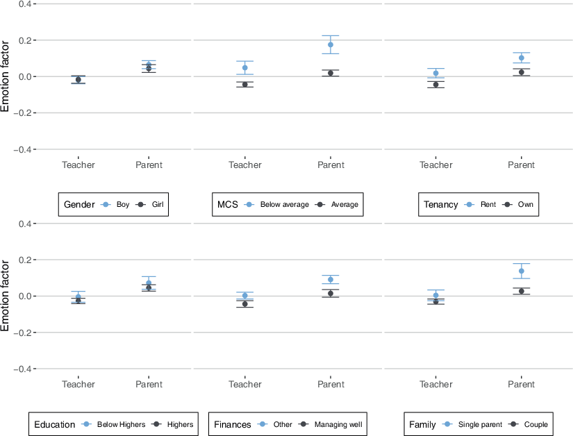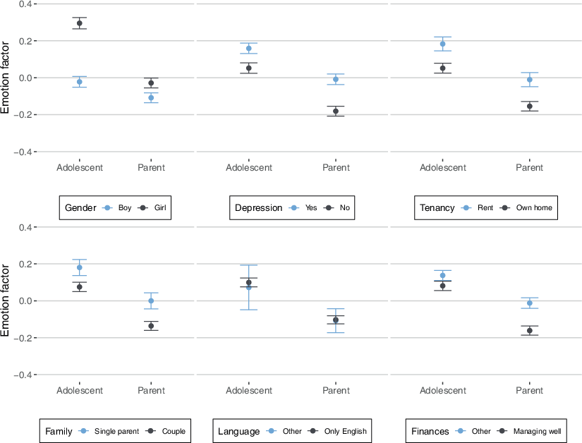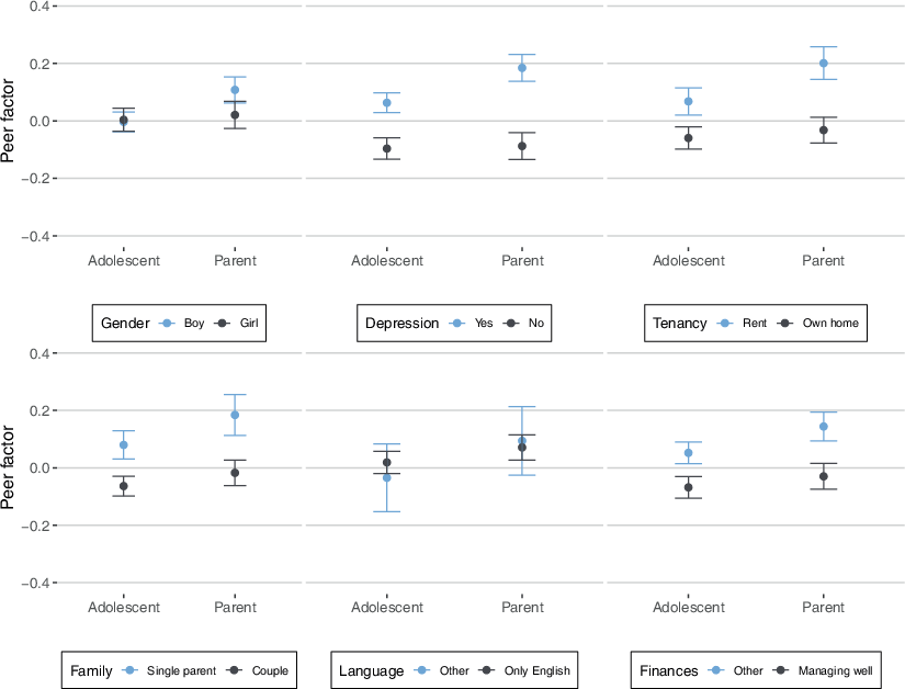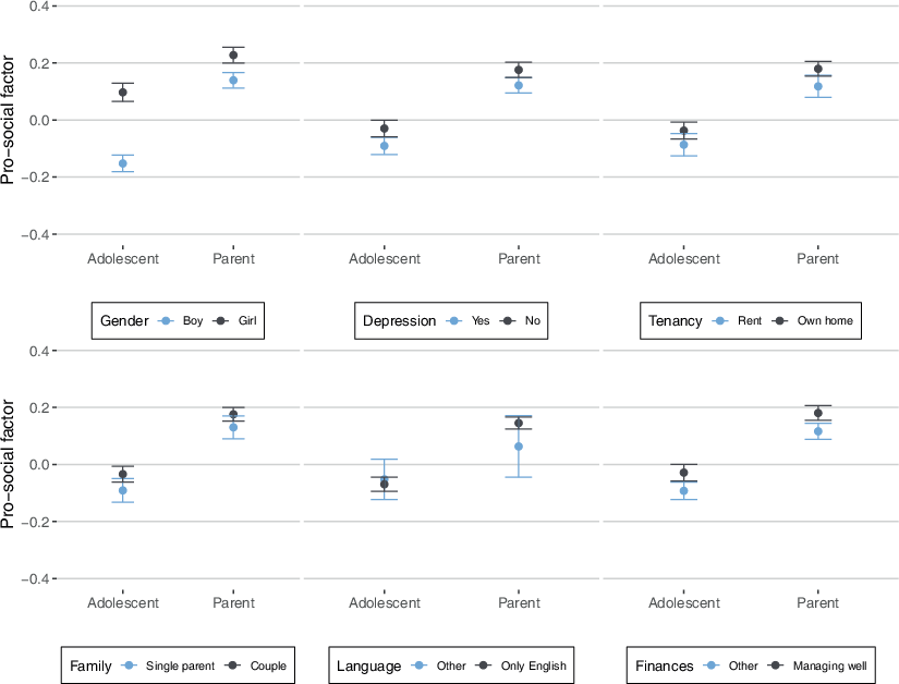 Socio-demographic attributes indeed influenced scoring divergently across respondent pairs. Figures 2 through Fig. 6 plot the model-implied means for LDS models conditional on participant characteristic, and Appendix Tables A5 to A16 provide the full numeric estimates for both the model-implied means and the main effects of each conditional variable on the latent difference factor () (see Supplement tables 2 through 32 for fully standardised and unweighted estimates). Gender, parental mental health, housing tenure, household financial stress and single parenthood each impacted the latent difference factor () for at least one component at the 95% confidence level.