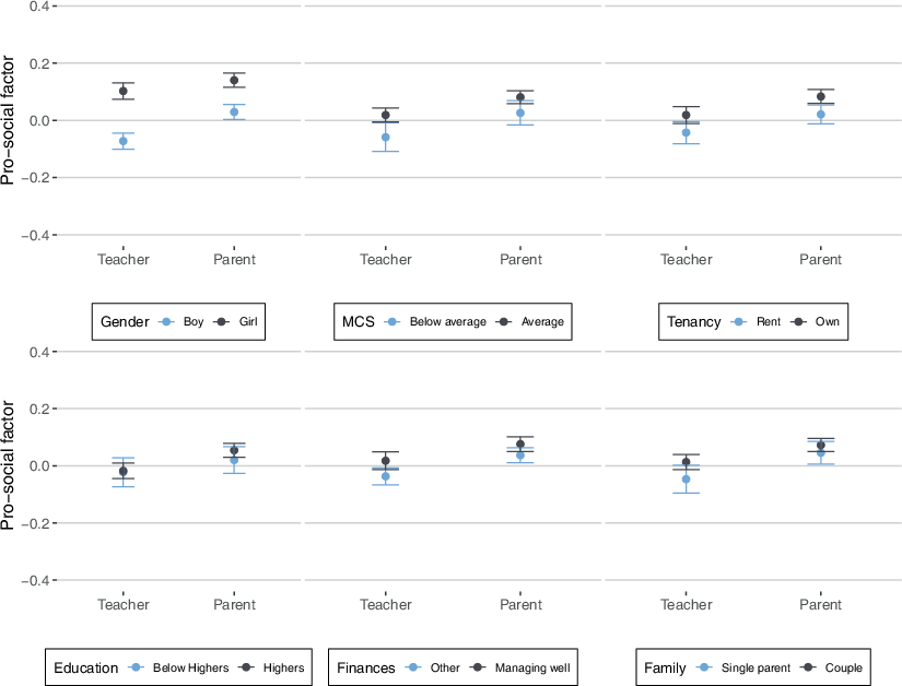 Considering gender, parents and teachers viewed boys to display fewer pro-social strengths, on average, than girls. Average discrepancies in pro-social behaviour ratings between parent-teacher () and parent-adolescent () respondent pairs were also significantly greater for ratings of boys than girls. Boy-parent respondent pairs also had elevated discrepancies in the peer problems component, although the difference between boys and girls average self-ratings of peer problems was not significant. Both parents and adolescents perceived worse emotional difficulties for girls than boys at age 14. The average emotional difficulties discrepancy factor was also significantly higher for girl-parent respondent pairs than boy-parent. Contrastingly, distances between boys and girls’ scores were not significantly divergent for parent or teacher ratings of emotional difficulties at age 10. The child’s gender also did not have a statistically significantly impact on parent-teacher discrepancies in perceptions of emotional difficulties.