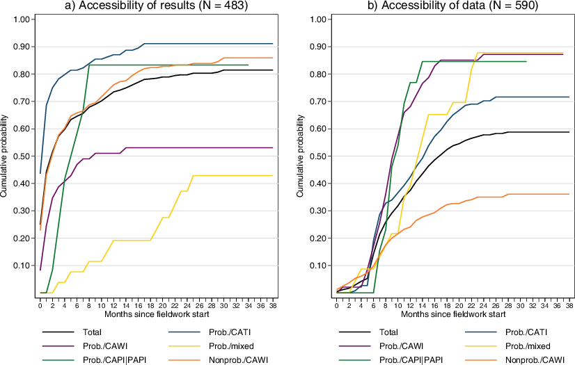 Regarding the accessibility of first results and survey data, whether and when (i.e., how quickly) the outputs are made available to researchers and the public are the decisive factors. Fig. 1 provides insights into the accessibility of results and survey data across our entire dataset by displaying the cumulative probability of the event occurrence (i.e., inverted survival functions) of both outcomes as a total and separately by survey design categories. These graphs reflect the probability that the event of interest has occurred up to a particular point in time.