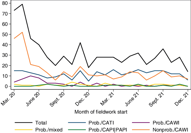 Regarding our analysis of the development over time, the development of the number of surveys over time is particularly revealing (Fig. 2). The peak in the first months of our observed period suggests that a high number of surveys was fielded at the beginning of the COVID-19 pandemic in Germany. A possible explanation for this development was the high demand for data in the early phase of the crisis. As the analysis by survey design indicates, the initial surge in the number of fielded surveys was mainly driven by nonprobability web surveys. In contrast, the number of probability-based surveys remained relatively stable over the observed period.
