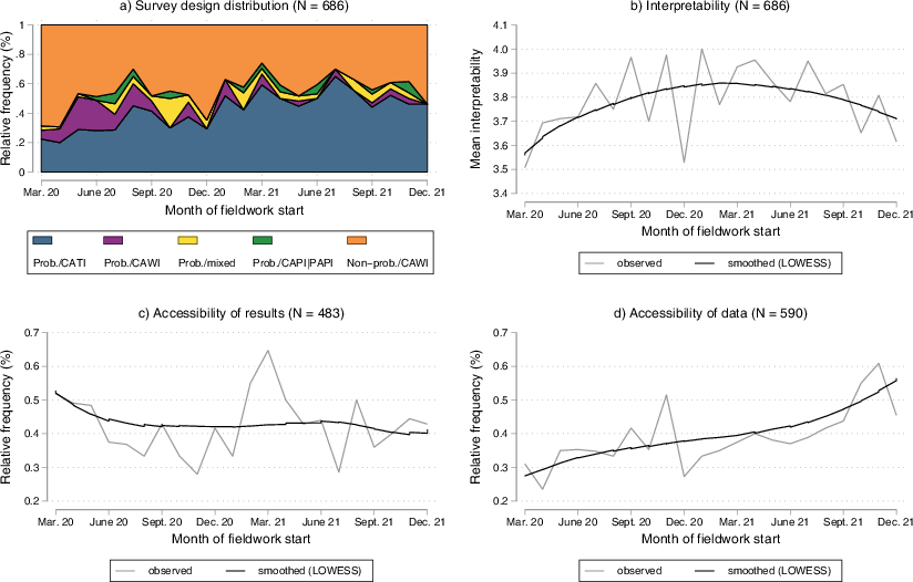 To answer RQ1 (“What was the quality of the social science surveys collected during the COVID-19 pandemic?”), we provide an overview of each survey quality dimension and assess how they developed over time between March 2020 and December 2021. Given the different specifications of each dimension, we applied diverse approaches. To assess survey designs, we plotted the frequency of survey design choices across time. Regarding interpretability, we showed the development of the mean index score, and with respect to accessibility, we examined the proportion of surveys for which results or data have been published up to a certain point in time.