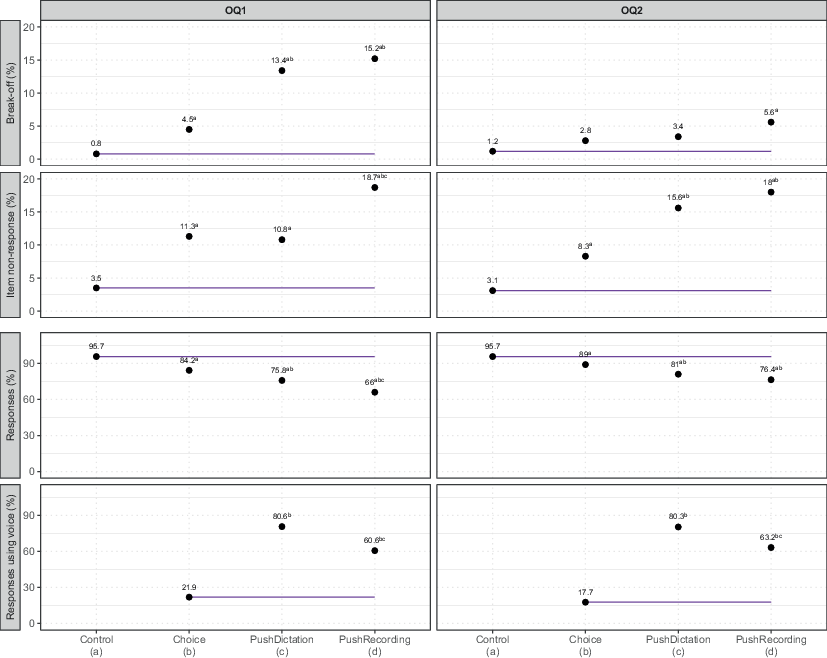 Regarding RQ1, the break-off rates are significantly higher in the experimental groups for the first experimental question relative to the control (as indicated by the superscript a), particularly in the push groups (peaking at 15% in the PushRecording group). The break-off rates for PushDictation and PushRecording are also significantly higher than for Choice for OQ1 (as indicated by the superscript b). For OQ2, break-off rates are substantially lower in the experimental groups (as expected given survival to this question), but remain significantly higher in the PushRecording than in the Control group. Item nonresponse is also significantly higher in all experimental groups, for both experimental questions. Overall, the rates of response are significantly higher in the Control group compared to all experimental groups, aligning with H1. Moreover, the Choice group has significantly higher response rates than the push groups, which also supports H1. However, the PushDictation group yields higher rates of response than the PushRecording group (not supporting H1), although this difference only reaches statistical significance for OQ1.