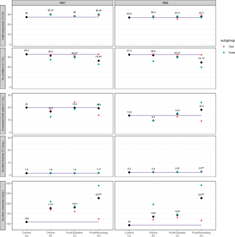 Fig. 2 presents the percentages of Valid answers (Coder 3 assessment), among those who provided any form of response, as well as the percentages of responses answering both parts of the question, where no problems were detected, and the average number of themes (using Coder 1 results) and characters (computed automatically), among those providing valid answers. It also presents how these indicators vary between participants who answered using text (red dots) or voice (blue dots), within each of the main groups of interest (Choice, PushDictation, and PushRecording). Full results (including sample sizes) are available in SOM5.