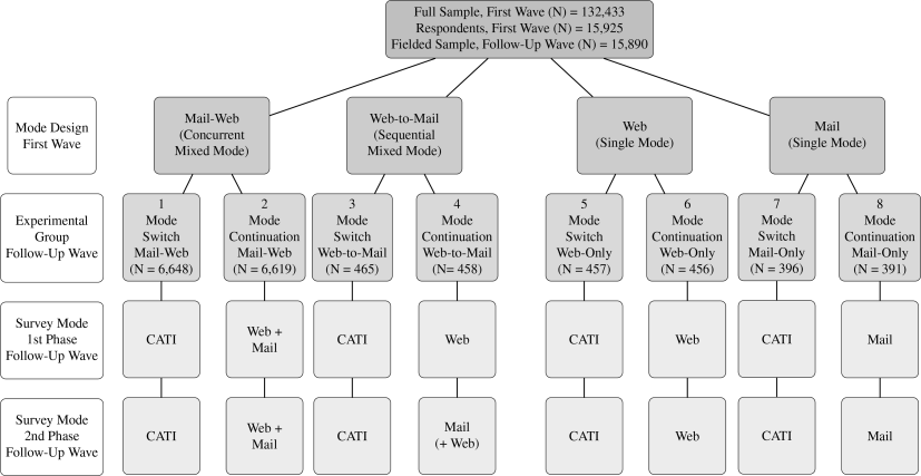 A total of 15,890 establishments were fielded in the follow-up wave (Q1/2021) experiment. These establishments are respondents from the first wave sample, where a sample of 132,433 establishments was fielded. The field period of the follow-up wave started on the 9th of January 2021 and ended 31th of March 2021. All establishments received an advance letter several days before the follow-up wave, thanking them for participating in the first wave and informing them about the upcoming follow-up survey. As in the first panel wave, all self-administered mode designs in the follow-up panel wave included postal invitation letters and one post-due-date reminder letter1. Following completion of the first wave questionnaire, participants were asked to provide details of a designated contact person and their corresponding telephone number. This designated contact person served as the recipient for all mailed correspondence in the follow-up wave, with a parallel arrangement for directing telephone contacts in the CATI mode design. If the telephone number used in the CATI mode design turned out to be invalid, alternative telephone numbers were obtained through extensive Internet research or from data available at the German Federal Employment Agency (Bundesagentur für Arbeit). We note that due to administrative reasons, all mode design groups were fielded in two tranches, resulting in a 37 day longer field period for observations in the first tranche than for those in the second tranche. In the Online Supplement B.1 Sample Tranches, we provide more details on the reasons for using separate tranches and dates of invitations and reminders of both tranches as well as additional sensitivity checks, which show that our results are robust to the impact of the tranches.