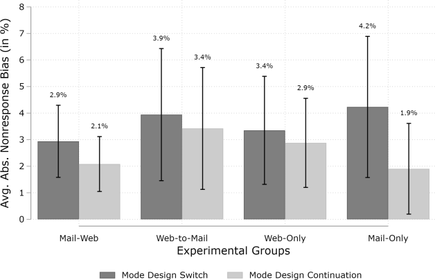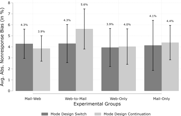 Fig. 4 depicts the average absolute nonresponse bias overall BHP administrative variables for the follow-up wave. The pattern of average absolute nonresponse bias in the follow-up wave mostly reflects the response rate patterns observed earlier. Switching to a CATI design in the follow-up wave exhibits slightly larger nonresponse biases in this wave, on average, compared to continuing the same self-administered mode design from the first wave. This is true for all of the self-administered mode designs considered. However, none of these differences is statistically significant. Overall, the average nonresponse bias estimates are not very large and are always below 4% for every mode design.