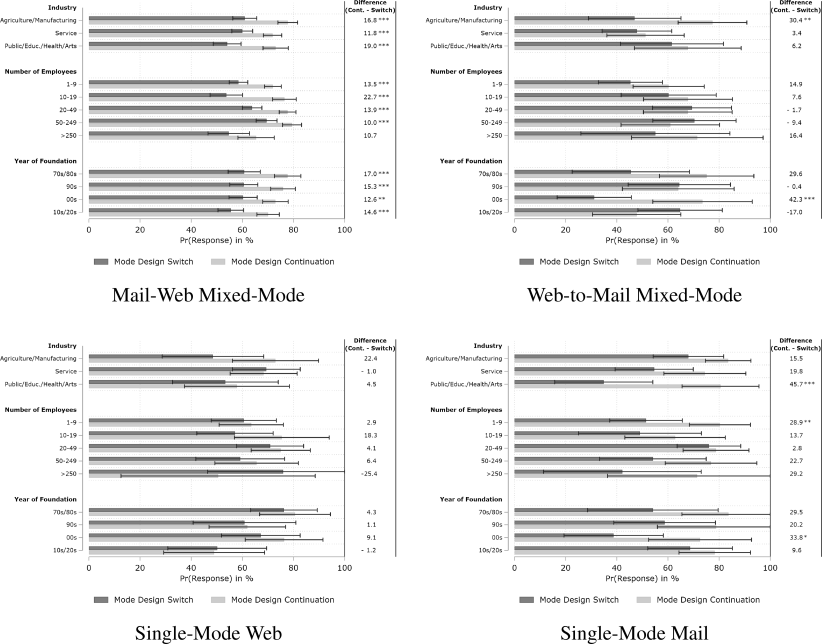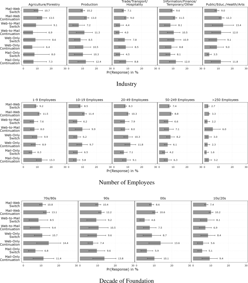 Lastly, for the single-mode mail design of the first wave (see Fig. 6d), establishments in the public/education/health/arts industry have a statistically significant 46%-points higher response probability in the follow-up wave under the continuation design than the switch design. Similarly, establishments with 1–9 employees show a 29%-points significantly higher response probability under the continuation design than the switch design. Additionally, the continuation design outperforms the switch design by 34%-points for establishments founded in the 2000s.