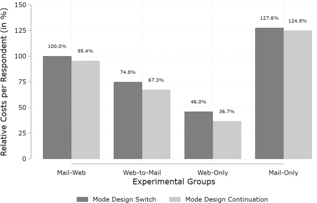 Fig. 9 depicts the cost structure associated with the mode design combinations used across both panel waves. It presents the relative costs of the different mode design combinations relative to the standard mode design combination used in the IAB-JVS (first wave: mail-web, follow-up wave: CATI).
