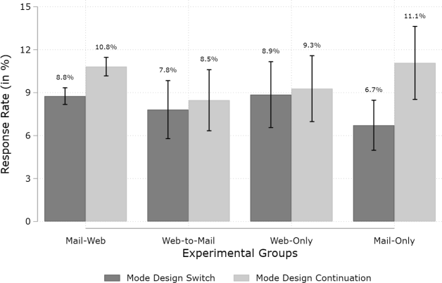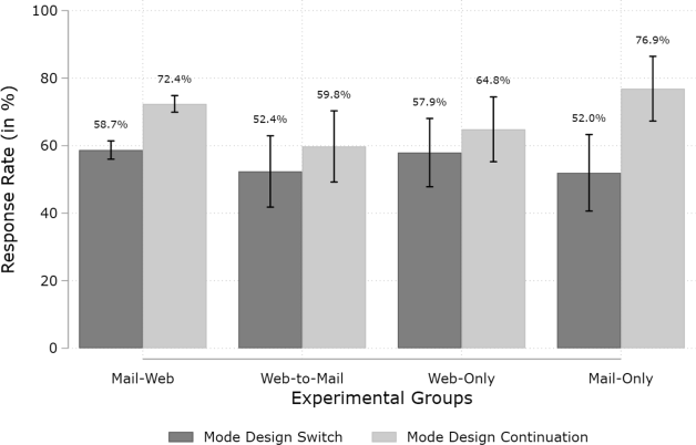 For all the following analyses, we first compare the effects of the mode design continuation and switch groups on survey participation in the follow-up wave for each of the mode design groups of the first panel wave. This is followed by comparing the effects of the mode design combinations over both panel waves on cumulative survey participation. Online Supplement B provides a tabular version of these response rates, including absolute numbers of responses and unweighted results.