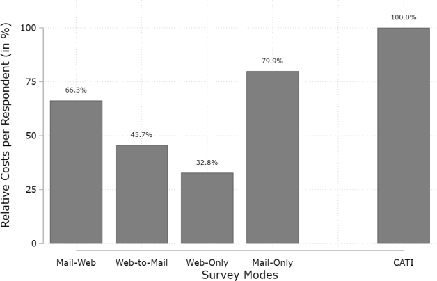 Fig. 9 depicts the cost structure associated with the mode design combinations used across both panel waves. It presents the relative costs of the different mode design combinations relative to the standard mode design combination used in the IAB-JVS (first wave: mail-web, follow-up wave: CATI).