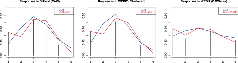 CUB models with covariates have been broadly applied to identify response profiles in terms of subjects’ characteristics (Capecchi and Piccolo 2017; Corduas et al. 2009; Fin et al. 2017) or objects’ features (Capecchi et al. 2016; Piccolo and D’Elia 2008). With respect to the state of the art on the topics, we propose to resort to CUB models to identify if there is any significant difference in response features (feeling, uncertainty, possible shelter effects) among independent groups of responses corresponding to different survey modes or questionnaire features. This circumstance applies, for instance, if a given ordered evaluation is collected on independent groups of respondents (yet homogeneous with respect to relevant covariates) via different survey modes (CATI, CAPI, CAWI), various visual layouts (vertical, horizontal, etc.), or with different scales (with or without a don’t know option, with different numbers of categories, labelled or not labelled categories, etc.). This task can be accomplished with the definition of suitable dummy variables identifying the different groups of responses, to be then included as covariates in a CUB model specification.