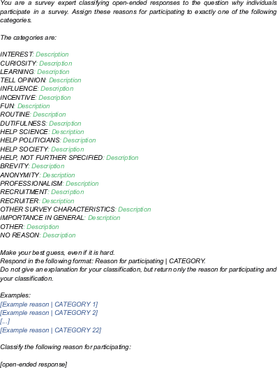 For the LLM-based classifications, we use the same coding scheme as was used by the human coders. It spans 22 categories, featuring both intrinsic, extrinsic, and survey-related reasons for participation (Porst & von Briel, 1995; Haensch et al., 2022). It also includes catch-all categories: No reason captures explicit statements of not having a reason for participation, “don’t know”s, as well as non-meaningful fillers such as “???”. In contrast, Other contains meaningful statements that cannot be assigned to any other category. For English translations of the categories, see Fig. 1. A more detailed coding scheme with definitions and examples for all categories and their groups can be found in Appendix I.
