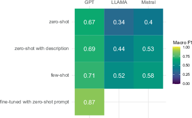We test and compare powerful and popular LLMs of three different model families that are state-of-the-art at the time of writing. Models of one of the industry leaders, OpenAI, are popularly used by the public and researchers without large computational expertise due to their user-friendly accessibility. Despite OpenAI’s lack of transparency and reproducibility as a proprietary provider (Palmer et al., 2023), it thus is reasonable to include one of their models in our research as a realistic use case. GPT-4o (GPT henceforth) is OpenAI’s flagship model at the time of writing, which, according to the developers, features considerable improvements in non-English languages over earlier versions, while being more time- and cost-efficient (OpenAI, 2024a, b). It is also supposed to be more capable of domain-specific or complex tasks and detailed labeling.