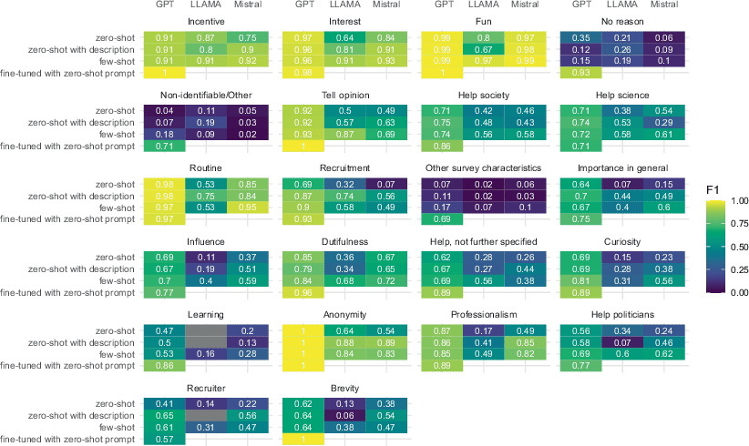 All LLMs examined exhibit approximately the same performance patterns across categories (see Fig. 3). They perform exceptionally well on the categories incentive, interest, and fun (macro F1 around 0.9), as well as on anonymity, routine, and tell opinion, and exceptionally poor (macro F1 between 0.02 and 0.3) on no reason, non-identifiable/other, and other survey characteristics. The LLMs thus perform very well on the three categories most commonly defined by the human coders, but not on the next two most common categories, which are non-substantive catch-all categories. For the remaining categories, performance tends to decrease along with frequency of occurrence. The overall pattern is mirrored across types of reasons (extrinsic, intrinsic, survey-related): GPT’s performance tends to be better than that of Llama and Mistral, which improves with few-shot prompting. There are some cases that stand out, which help explain the overall performative edge GPT has over the open-source models. GPT outperforms Llama and Mistral especially in tell opinion, routine, importance in general, influence, dutifulness, curiosity, and professionalism, and to a lesser extent also in the help categories, although Llama and especially Mistral improve under few-shot prompting.6