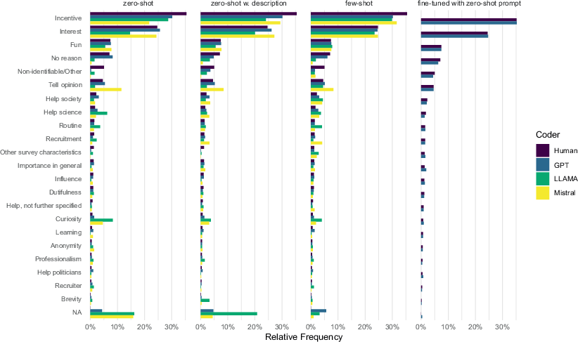 Although all prompting approaches examined approximately result in very similar distributions of categories, few-shot prompting tends to approximate the distribution of the human-coded data best (Fig. 4). This is especially the case for interest and tell opinion. Large differences remain especially for non-identifiable/other, help science, and help society. Few-shot prompting also results in substantially fewer responses that were not coded successfully, with a reduction of almost four fifths for Mistral. As a consequence, there are almost no missing classifications under few-shot prompting, except for no reason (Figure A3). Fine-tuning results in a distribution that perfectly matches the human classifications, with only four classifications missing in total (all belonging to the no reason category).